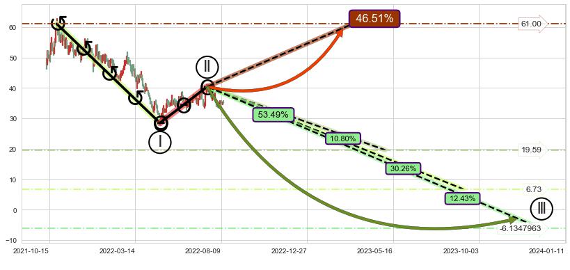 ➣ 调整浪已超过预测的c点位置,后续大趋势循环浪继续下跌概率53.49%,谨慎做多