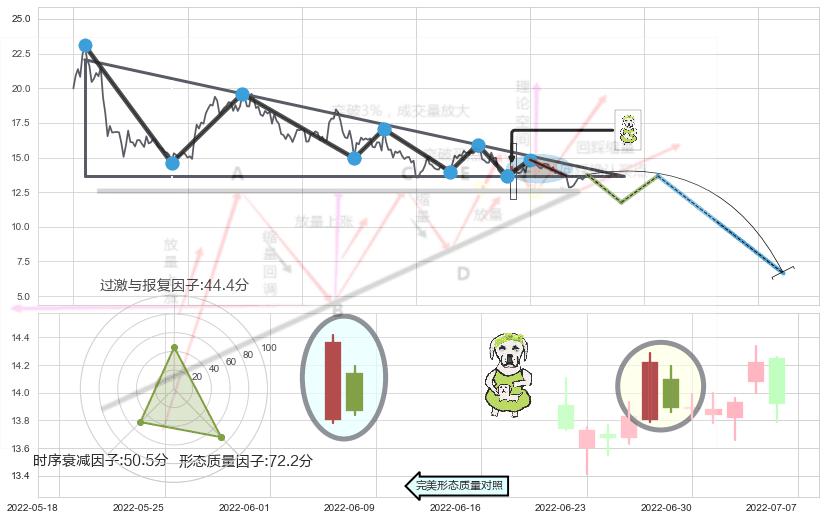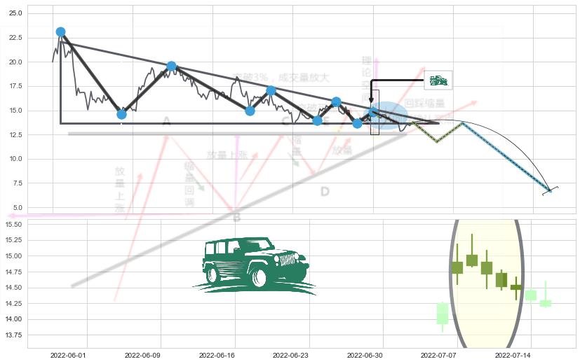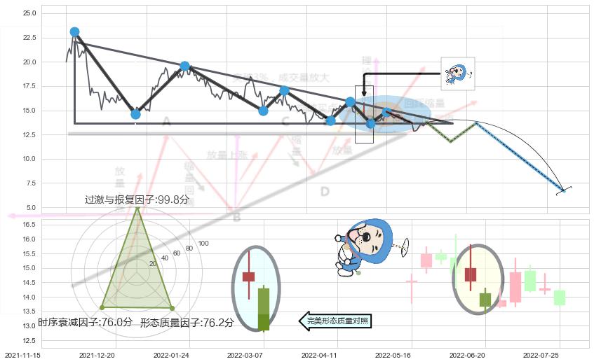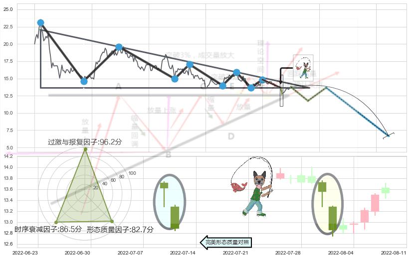 ➢ 【多方力量耗尽,空方打破攻守平衡点】下降三角形中继整理, 已在2022-08-01突破【支撑】颈线 13.67 →演变成下降通道