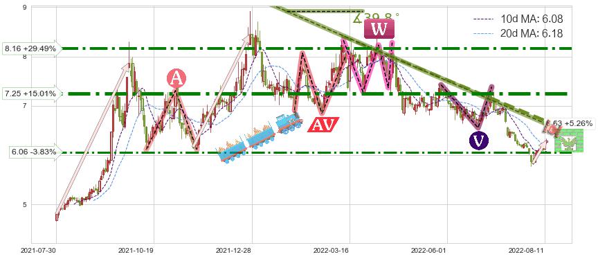 ♘ 阻力价格位6.06,可信任强度66.72%,距离最后交易2022-08-12形成的收盘价格6.30相差 -3.83%