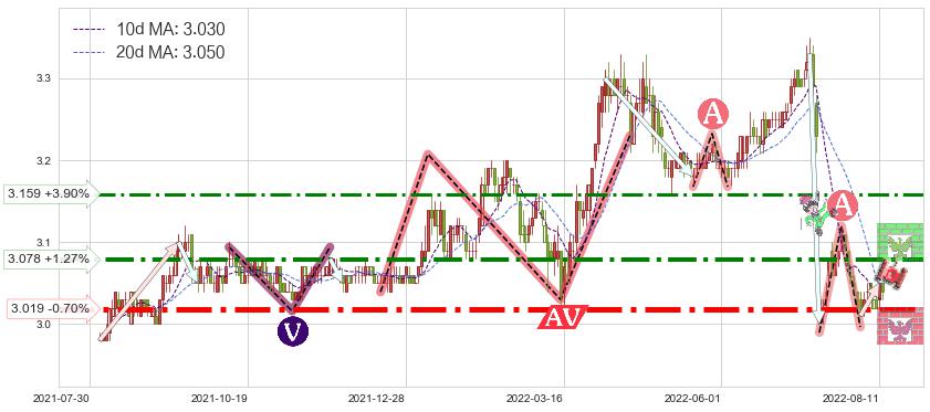 ♘ 阻力价格位3.078,可信任强度76.32%,距离最后交易2022-08-12形成的收盘价格3.040相差 +1.27%