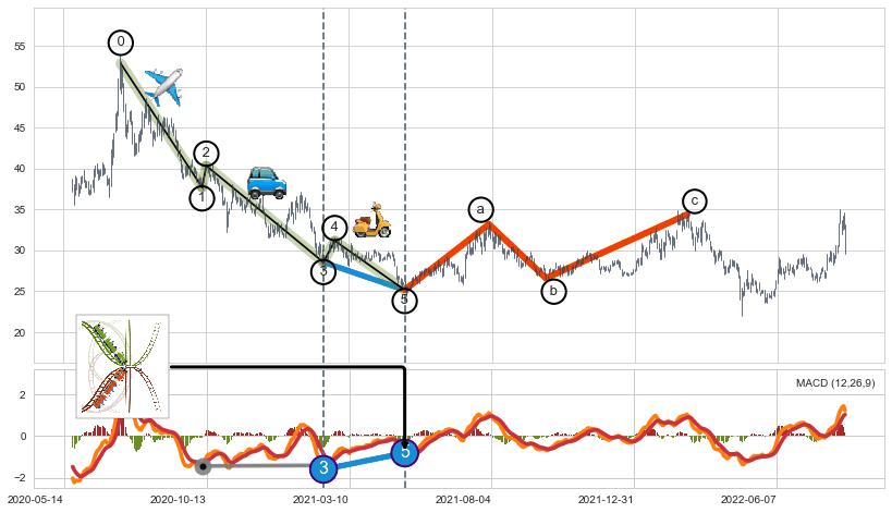 ➣ 第一, 三, 五浪下跌动能逐渐【衰弱变小】,趋势呈现不稳迹象