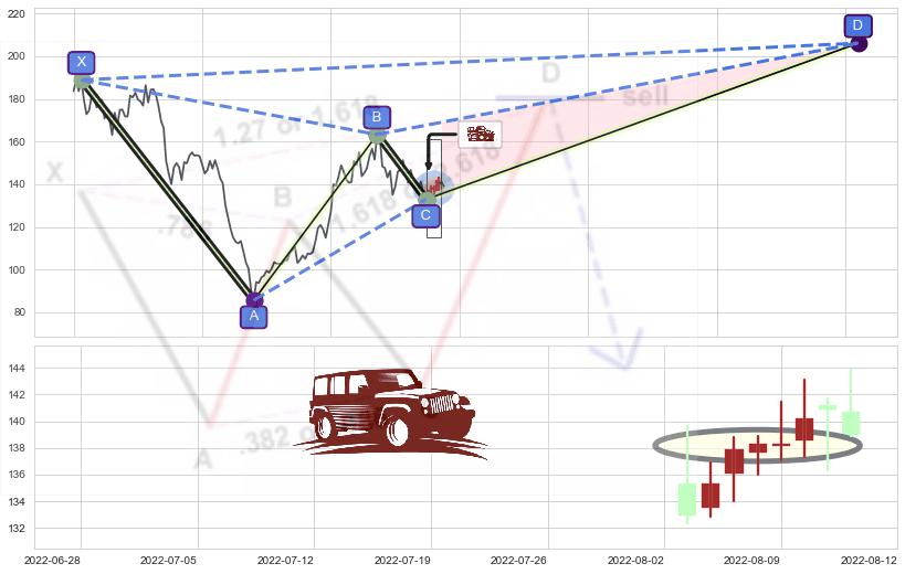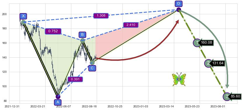 ➣ 未完成【蝴蝶】形态起点X: 2022-01-12, 已到达C点: 2022-08-03, 预测最终D点: 2023-03-27, 共302交易日