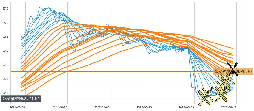 ➢ 5小时均线于(2022-08-11: 26.65)形成【死叉】基于【死叉历史模型】预测死叉后最低波谷价格: 21.51, 死叉后最低价格26.40,尚未达到预测最低波谷价格, 预期继续下跌