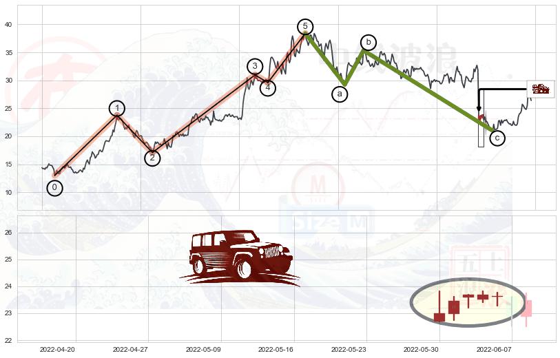 ➣ 波浪理论:猜想击穿破位c点后继续下跌 → 下跌 → 风险信号 → 小趋势跟踪