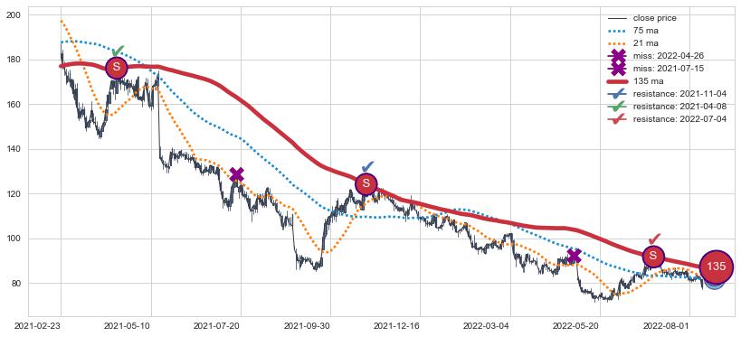 ➣ 75小时均线于(2022-08-09: 81.94)形成【死叉】基于【死叉历史模型】预测死叉后最低波谷价格: 62.21, 死叉后最低价格78.03,尚未达到预测最低波谷价格, 预期继续下跌