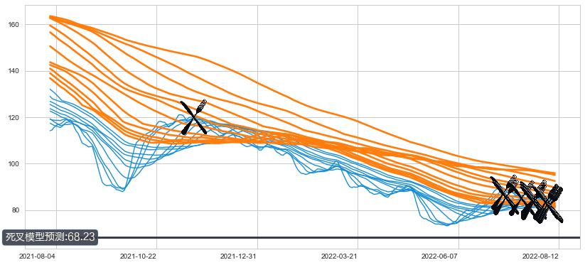 ➣ 90小时均线于(2022-08-05: 83.00)形成【死叉】基于【死叉历史模型】预测死叉后最低波谷价格: 61.05, 死叉后最低价格78.03,尚未达到预测最低波谷价格, 预期继续下跌