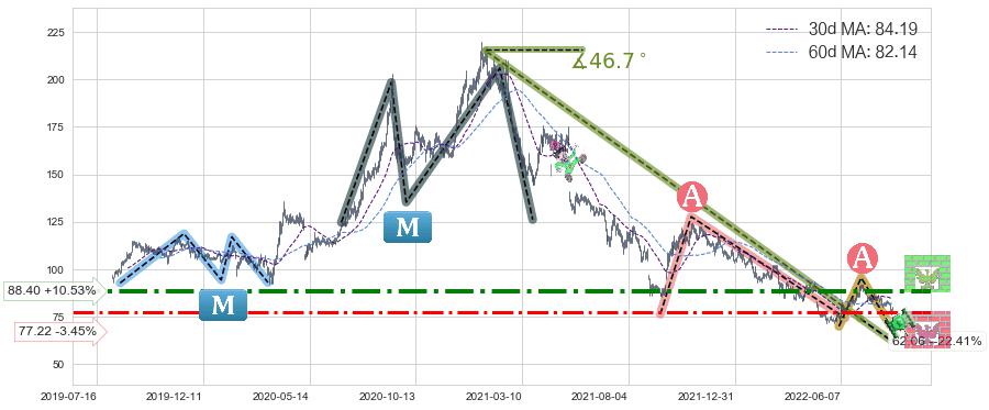 ♘ 支撑价格位77.22,可信任强度59.38%,距离最后交易2022-08-12形成的收盘价格79.98相差 -3.45%
