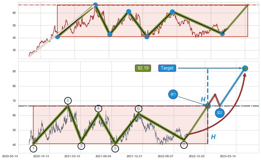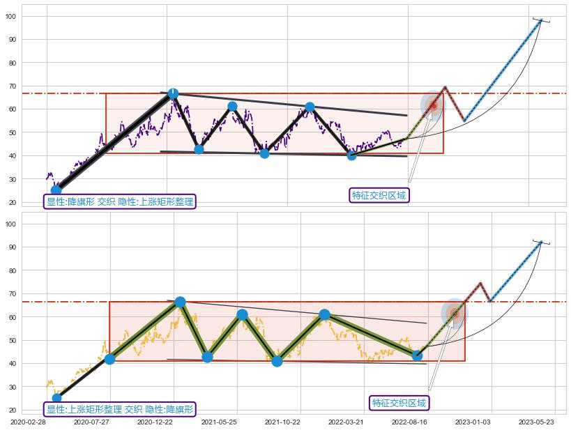 ➣ 上涨矩形整理:猜想临近关键阻力位突破点 → 临近拐点上涨 → 机会信号 → 大趋势均值回复