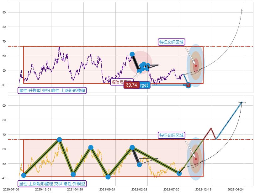 ➢ 升旗形临近target支撑拐点上涨 🔜 升楔型临近target支撑拐点上涨 综合量化分数:50.84 【中性】