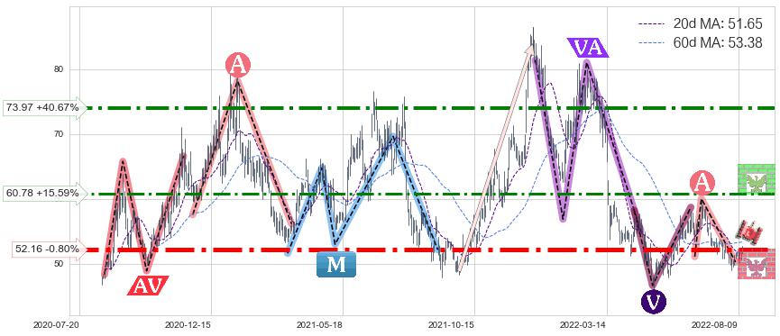 ♘ 支撑价格位52.16,可信任强度88.46%,距离最后交易2022-08-12形成的收盘价格52.58相差 -0.80%