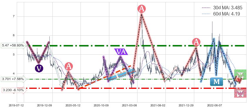 ♘ 阻力价格位3.701,可信任强度49.41%,距离最后交易2022-08-12形成的收盘价格3.440相差 +7.58%
