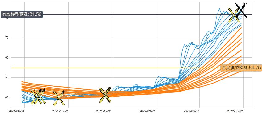 ➢ 55小时均线于(2021-08-23: 40.18)形成【金叉】基于【金叉历史模型】预测金叉后最高波峰价格: 44.37, 金叉后最高价格87.47,已经上涨超出预测最高波峰价格, 预期回调