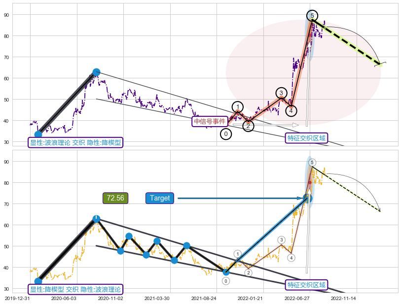 ➢ 降楔型target阻力拐点下跌 🔜 波浪理论上涨浪:浪5回调拐点 综合量化分数:44.45 【偏空】