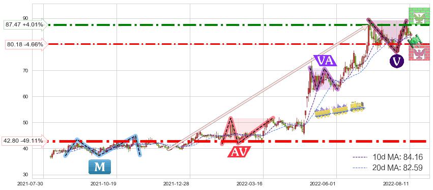 ♘ 支撑价格位80.18,可信任强度56.39%,距离最后交易2022-08-12形成的收盘价格84.10相差 -4.66%