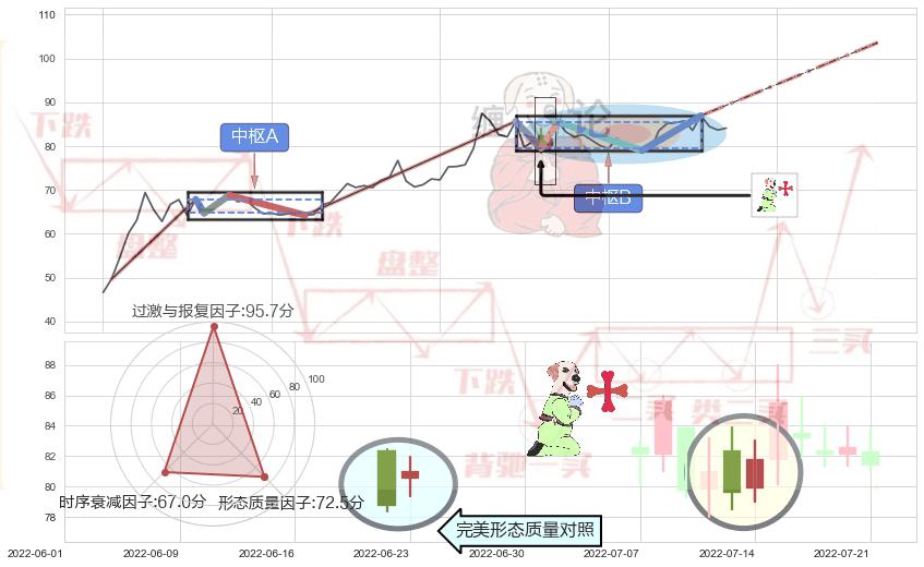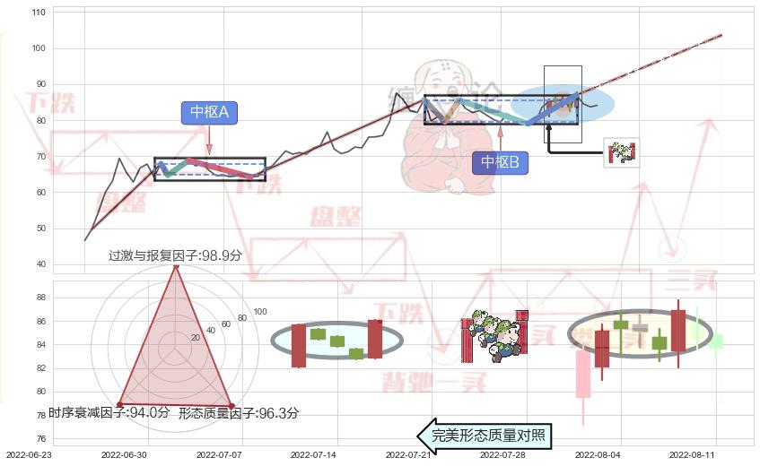➣ 【中枢B】:2022-07-08-2022-08-09,中枢由5笔构成,共23交易日, ZG=85.53, ZD=79.57