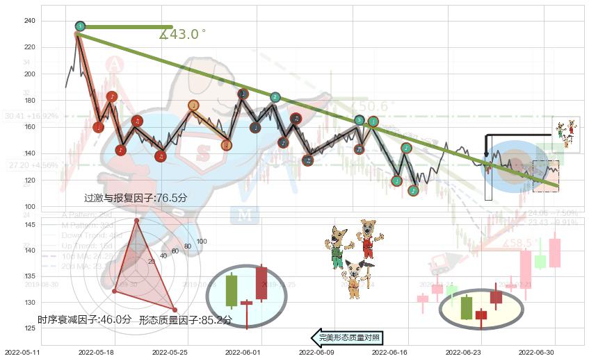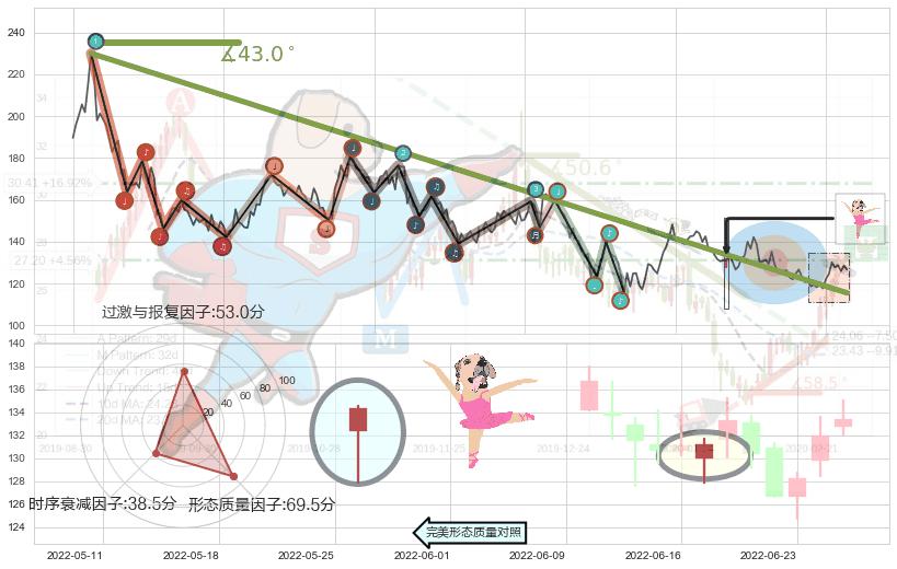 从2021-07-30至2022-05-20,共包含193个交易日,阶段股价下跌-37.22%,阶段股价变动位移路程比: 1 : 13,下跌趋势角度: 43.0
