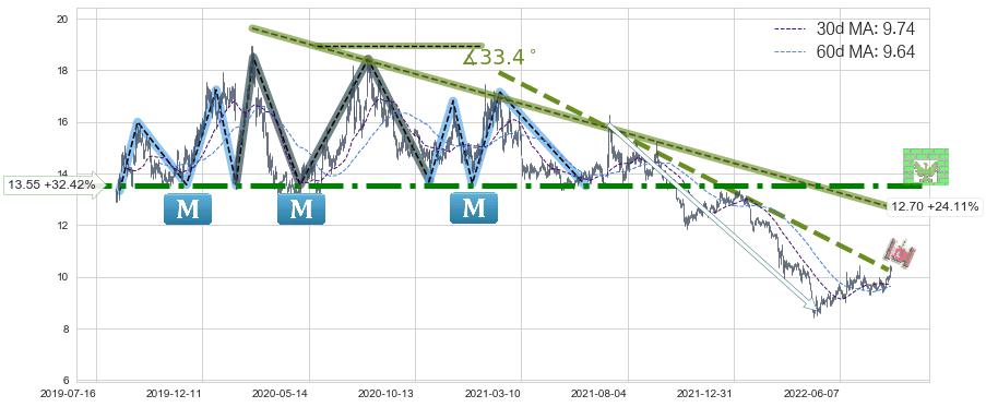 ♘ 阻力价格位13.55,可信任强度93.45%,距离最后交易2022-08-12形成的收盘价格10.23相差 +32.42%