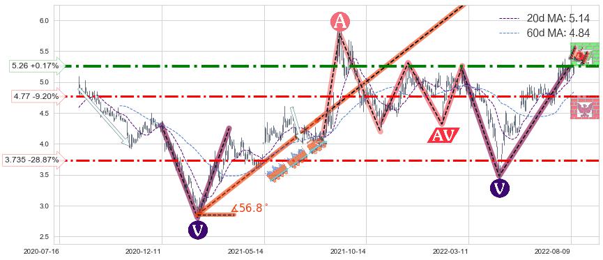 ♘ 阻力价格位5.26,可信任强度79.56%,距离最后交易2022-08-12形成的收盘价格5.25相差 +0.17%