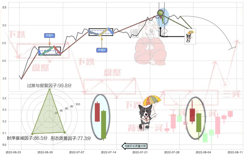 🍖 长线趋势跟踪组合短线均值回复[强支撑信号]2022-04-27-2022-08-02上升趋势依然成立(上涨趋势跟踪依然可行),短线价格略微下行回调(均值回复猜想),即将接近趋势提供的未破位的支撑价格:5.16。