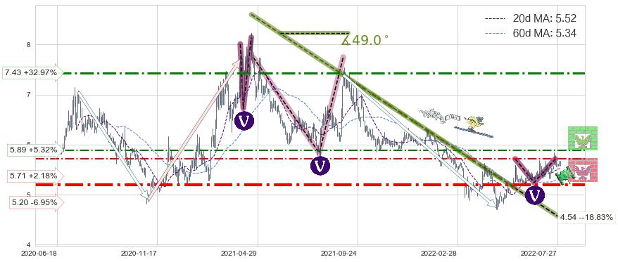 ♘ 阻力价格位5.89,可信任强度47.26%,距离最后交易2022-08-01形成的收盘价格5.59相差 +5.32%