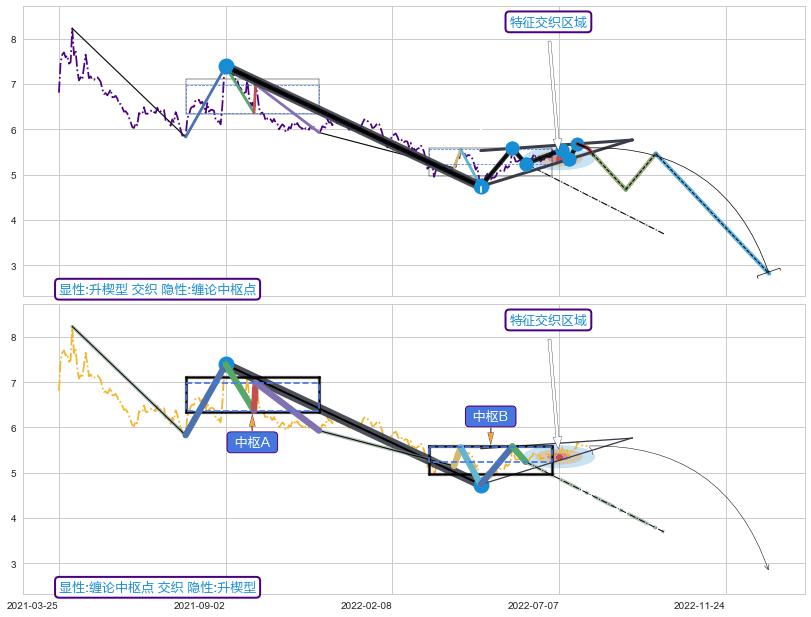 ➣ 缠论中枢点:猜想破位中枢B后持续下拉 → 下跌 → 破位中枢B支撑 → 持续趋势跟踪