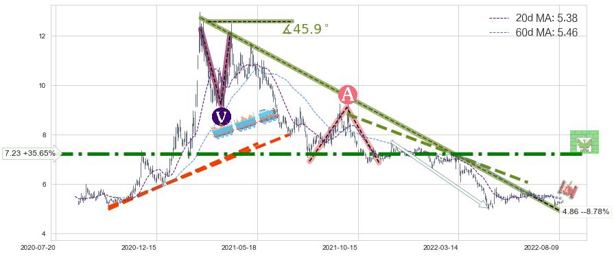 ♘ 阻力价格位7.23,可信任强度89.89%,距离最后交易2022-08-12形成的收盘价格5.33相差 +35.65%