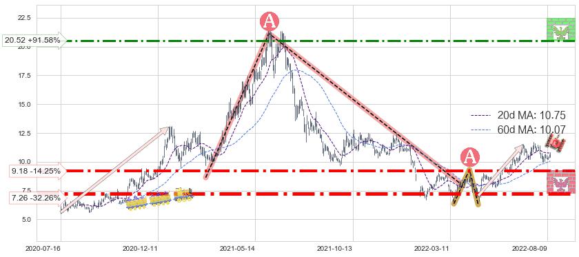 ♘ 阻力价格位20.52,可信任强度57.08%,距离最后交易2022-08-12形成的收盘价格10.71相差 +91.58%