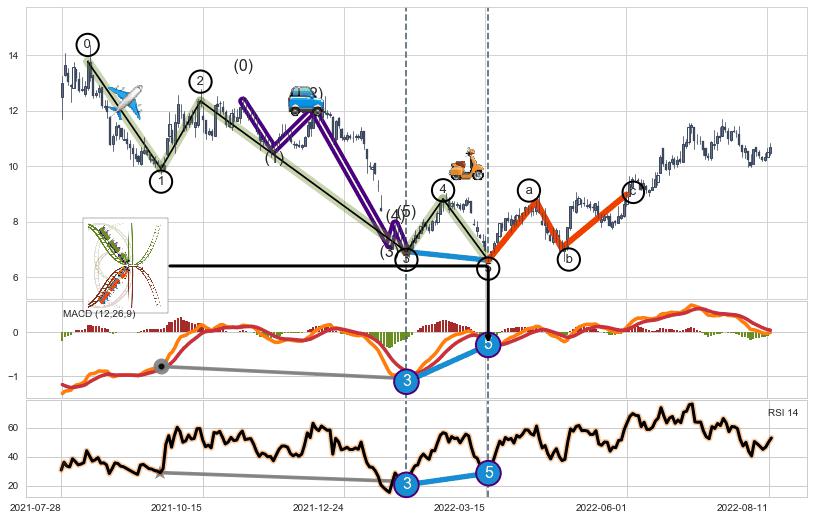 ➣ 第一, 三, 五浪下跌动能逐渐【衰弱变小】,趋势呈现不稳迹象