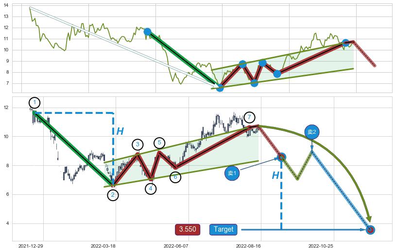 ➢ 最小中继整理涨幅→𝐇: 3.640 (𝐇楔型旗杆的长度:楔型起点→顶点)