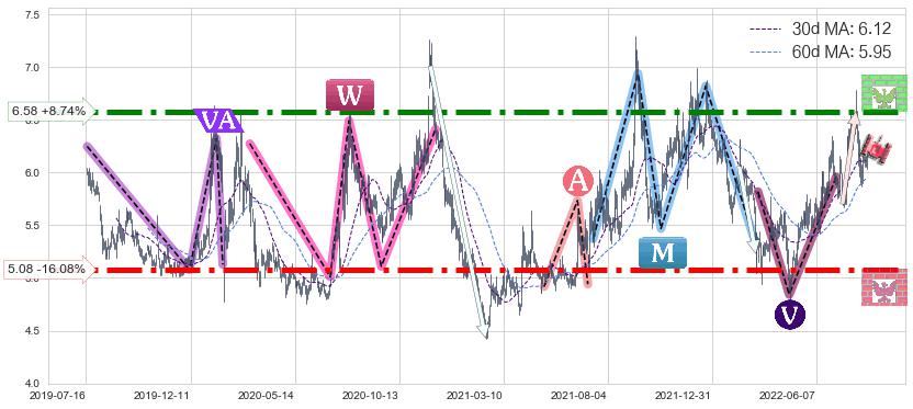 ♘ 阻力价格位6.58,可信任强度93.79%,距离最后交易2022-08-12形成的收盘价格6.05相差 +8.74%