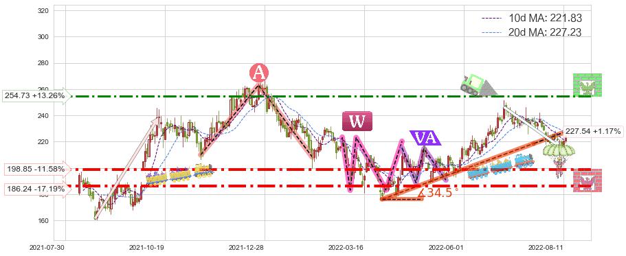♘ 支撑价格位198.85,可信任强度75.01%,距离最后交易2022-08-12形成的收盘价格224.90相差 -11.58%