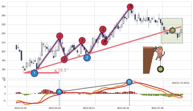 ✂️ 2022-03-29-2022-07-21上升趋势存在反转[风险],虽然原上升趋势的支撑位(227.54)已破位,但其支撑效果尚存,原上升趋势角度: 34.5˚