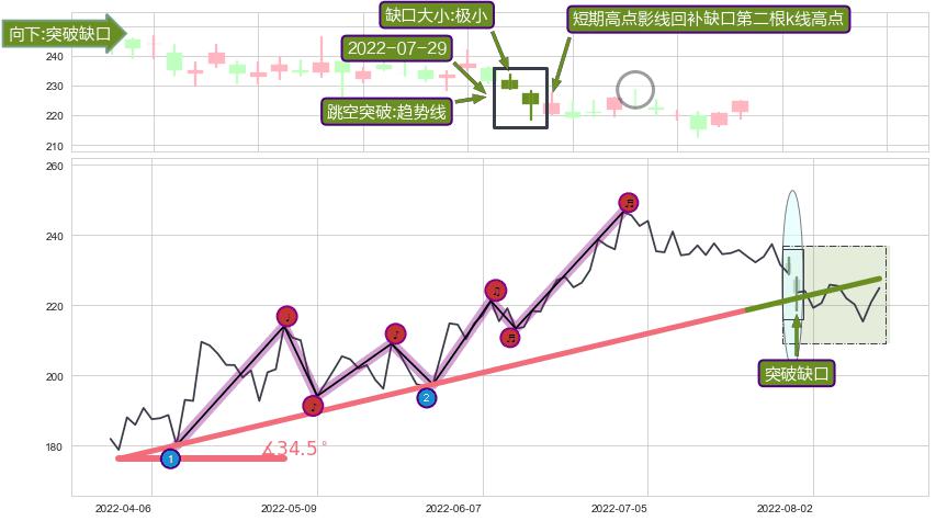 ➢ 高点影线(2022-08-05: 228.57 )→回踩→第二根k线高点(2022-07-29: 228.00 )