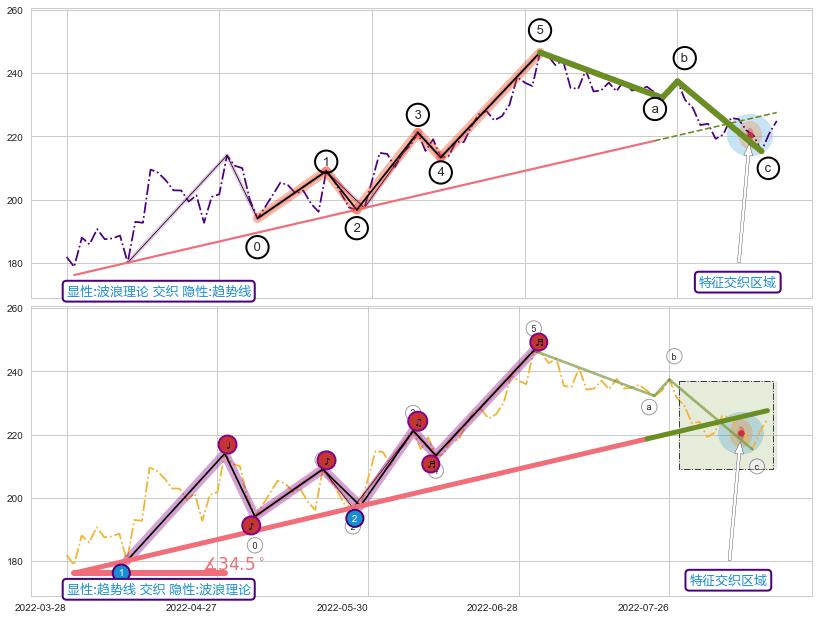 ➢ 波浪理论与趋势线信号事件周期长度级别相同,同周期信号事件