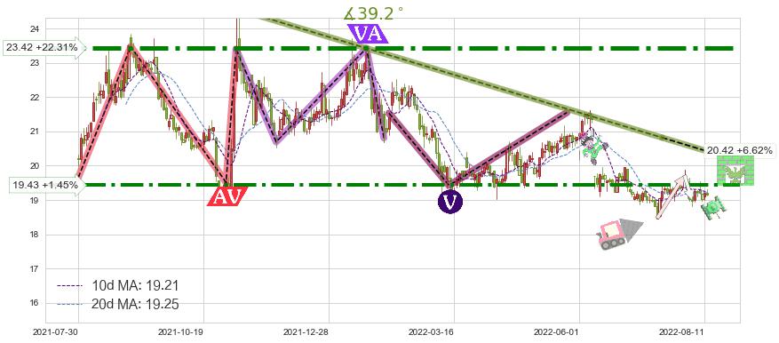 ♘ 阻力价格位19.43,可信任强度80.10%,距离最后交易2022-08-12形成的收盘价格19.15相差 +1.45%