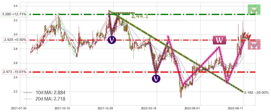 ♘ 阻力价格位3.280,可信任强度74.29%,距离最后交易2022-08-12形成的收盘价格2.910相差 +12.71%