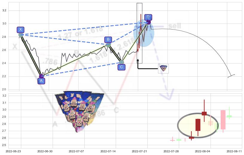 ➣ 谐波蝴蝶:已到达d点:猜想c拉升到达d点后泄力性下沉下跌(均值回复)