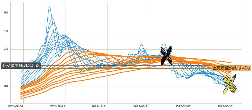 ➣ 60小时均线于(2022-04-20: 3.823)形成【死叉】基于【死叉历史模型】预测死叉后最低波谷价格: 3.514, 死叉后最低价格2.900,已经下跌超出预测最低波谷价格, 预期反弹