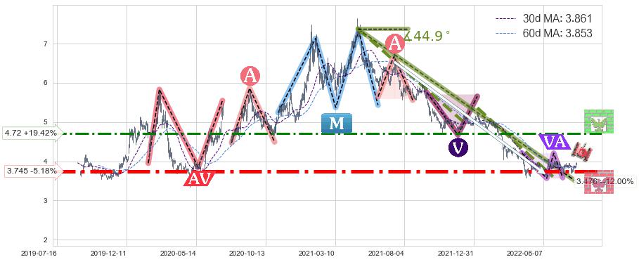 ♘ 阻力价格位4.72,可信任强度69.62%,距离最后交易2022-08-12形成的收盘价格3.950相差 +19.42%
