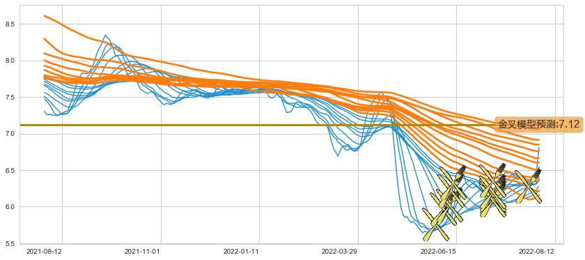 ➣ 70小时均线于(2022-07-11: 6.35)形成【金叉】基于【金叉历史模型】预测金叉后最高波峰价格: 7.47, 金叉后最高价格7.76,已经上涨超出预测最高波峰价格, 预期回调