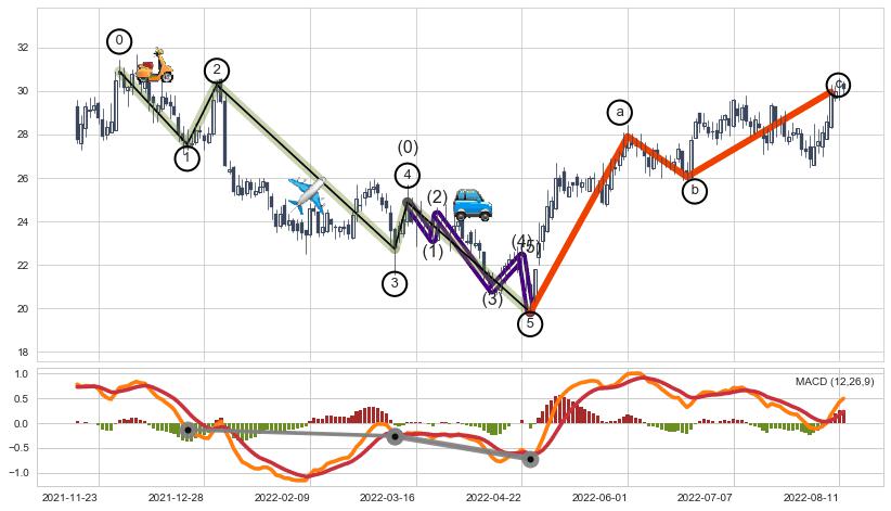 ➣ 波浪理论:猜想达到c点后小反弹终止反转下跌 → 下跌 → 【拐点】临近 → 阶段均值回复结束后继续大周期趋势跟踪