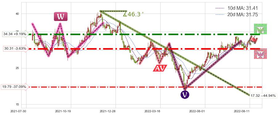 ♘ 阻力价格位34.34,可信任强度91.50%,距离最后交易2022-08-12形成的收盘价格31.45相差 +9.19%