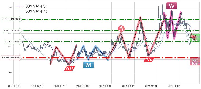 ♘ 阻力价格位4.18,可信任强度72.56%,距离最后交易2022-08-12形成的收盘价格4.24相差 -1.39%