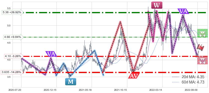 ♘ 支撑价格位4.10,可信任强度74.11%,距离最后交易2022-08-12形成的收盘价格4.24相差 -3.26%
