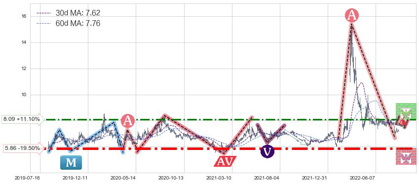 ♘ 阻力价格位8.09,可信任强度61.00%,距离最后交易2022-08-12形成的收盘价格7.28相差 +11.10%