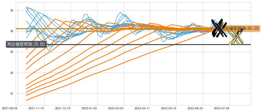 ➣ 55小时均线于(2022-07-14: 30.21)形成【死叉】基于【死叉历史模型】预测死叉后最低波谷价格: 26.21, 死叉后最低价格27.52,尚未达到预测最低波谷价格, 预期继续下跌