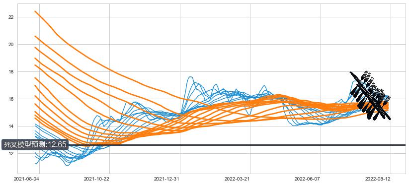 ➣ 70小时均线于(2022-08-05: 15.29)形成【死叉】基于【死叉历史模型】预测死叉后最低波谷价格: 11.79, 死叉后最低价格14.80,尚未达到预测最低波谷价格, 预期继续下跌