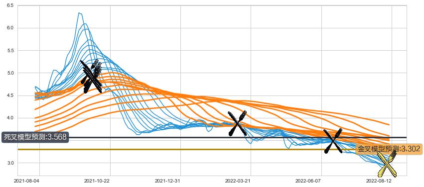 ➣ 55小时均线于(2022-03-07: 3.861)形成【死叉】基于【死叉历史模型】预测死叉后最低波谷价格: 3.553, 死叉后最低价格2.860,已经下跌超出预测最低波谷价格, 预期反弹