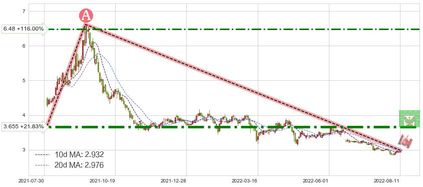 ♘ 阻力价格位3.655,可信任强度88.19%,距离最后交易2022-08-12形成的收盘价格3.000相差 +21.83%