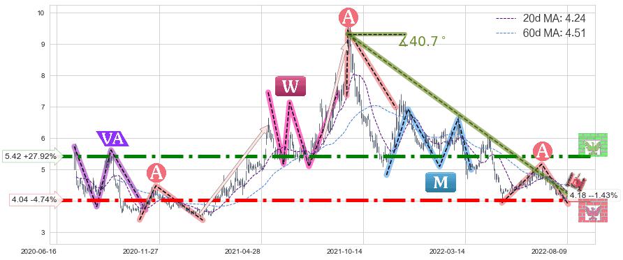 ♘ 阻力价格位5.42,可信任强度91.67%,距离最后交易2022-08-12形成的收盘价格4.24相差 +27.92%